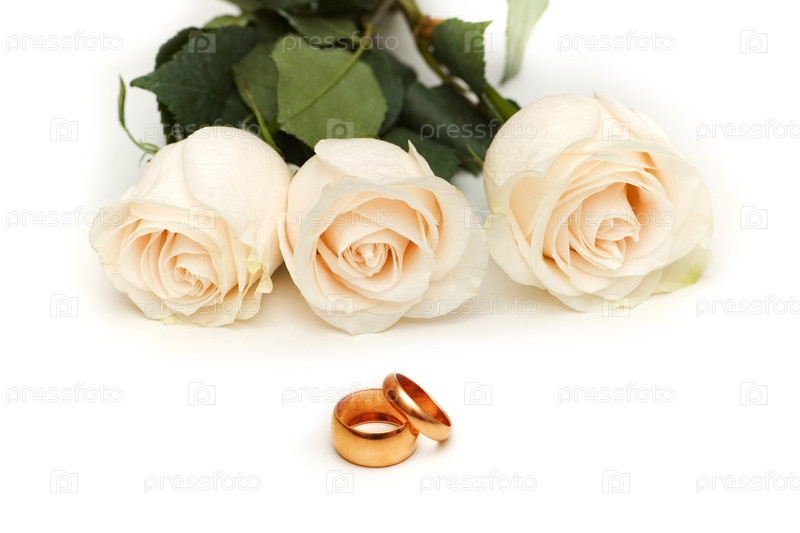 Розы и золотые кольца на белом фоне