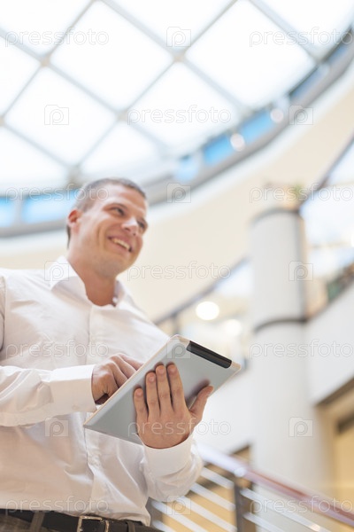 Человек с планшетным компьютером в современном деловом здании