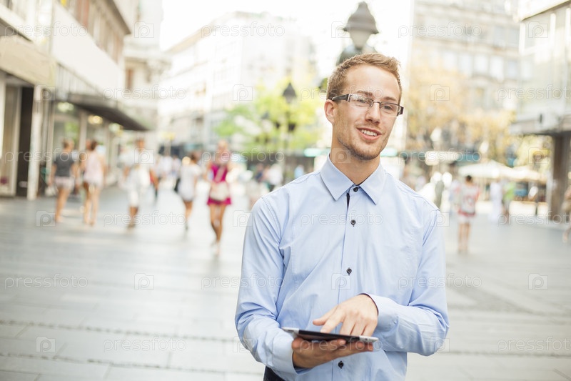 Мужчина с планшетным компьютером на городской улице