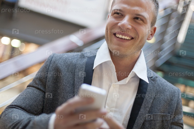 Бизнесмен читает смс на смартфоне в офисном здании