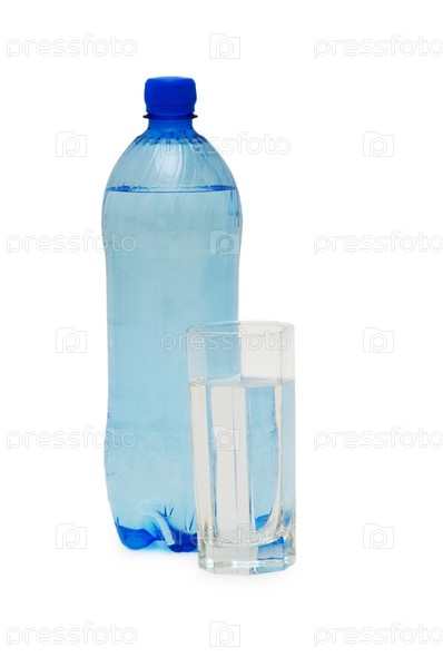 Бутылка воды и стакан на белом фоне