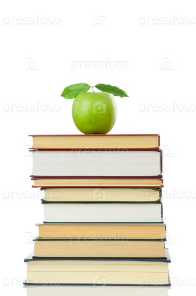 Зеленое яблоко на стопке книг