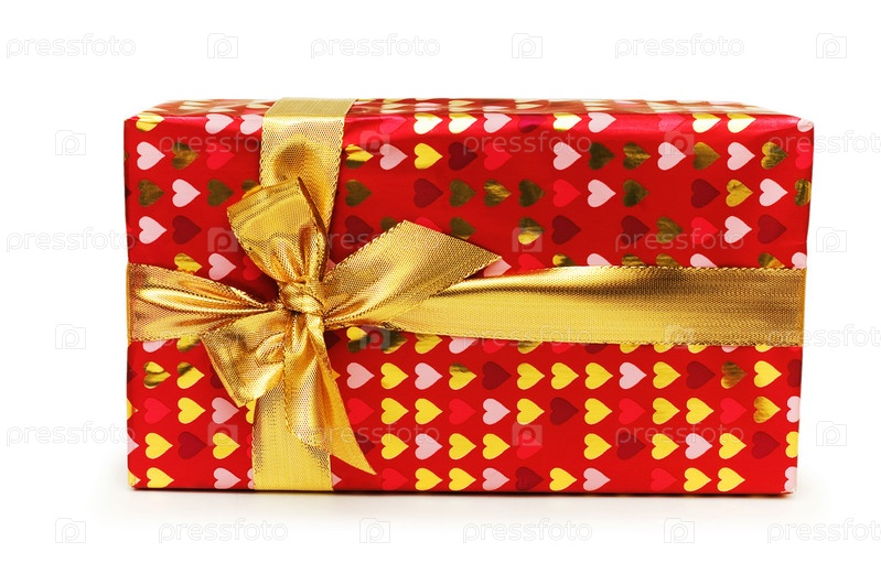 Подарок в яркой упаковке на белом фоне