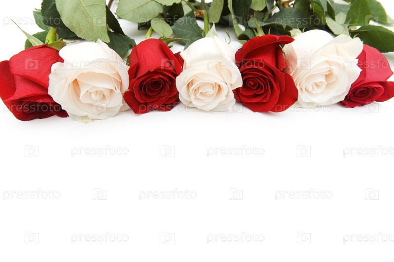Красные и белые розы лежат в ряд на белом фоне