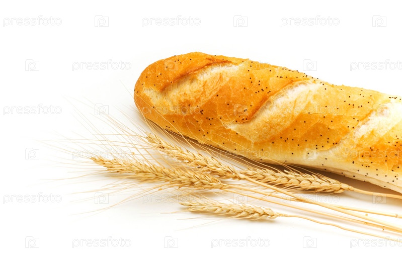 Свежий батон и пшеница на белом фоне
