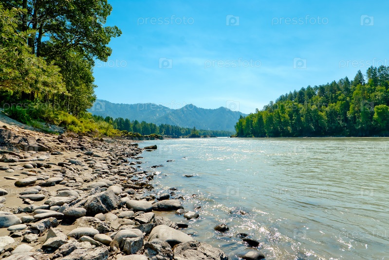 Каменистый берег горной реки Катунь. Горный Алтай, Россия
