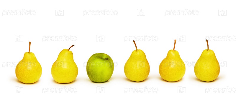 Зеленое яблоко среди груш на белом фоне