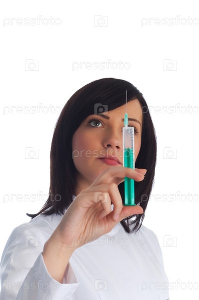 Красивая женщина в белом халате со шприцем в руке