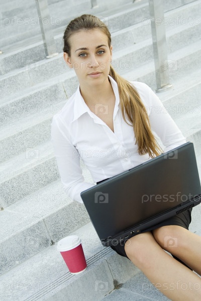 Девушка сидящая на ступеньках с ноутбуком