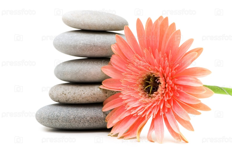 Гербера и стопка из гальки на белом фоне