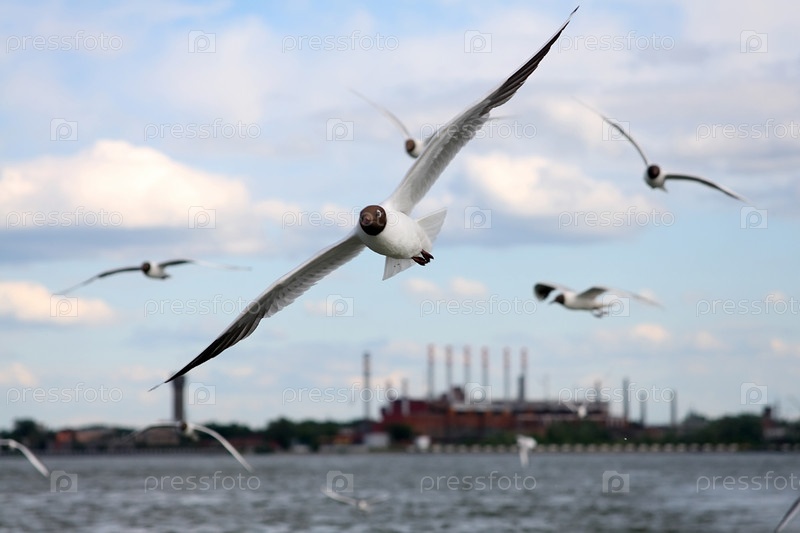 Чайки на фоне неба. Лето, город