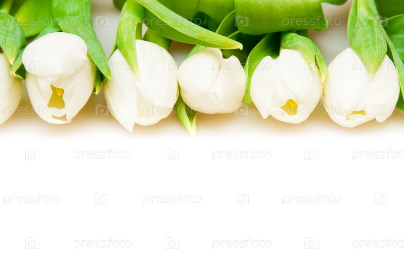 Ряд белых тюльпанов на белом фоне
