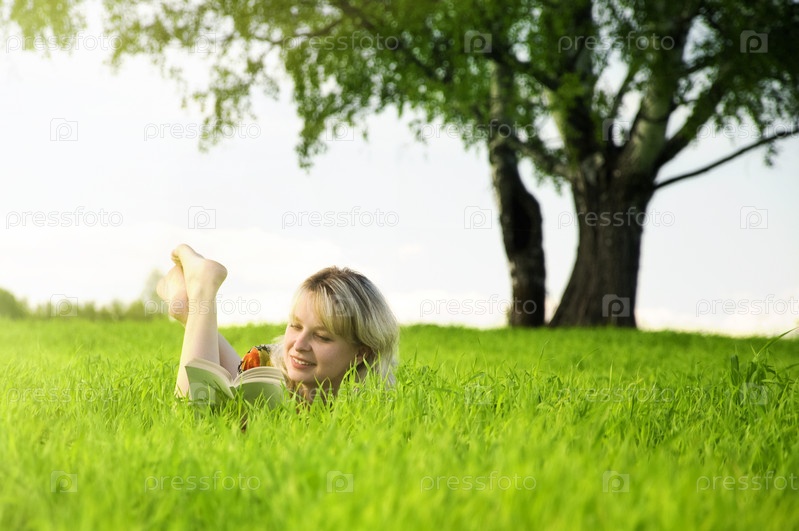 Девушка читает, лежа в траве