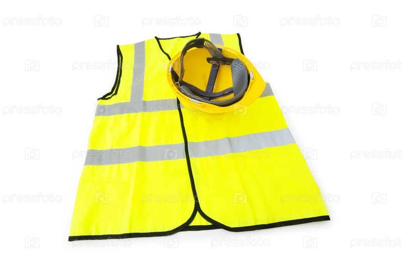 Желтый жилет и каска на белом фоне