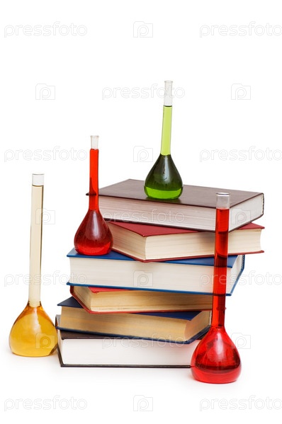 Разноцветные колбы и стопка книг на белом фоне