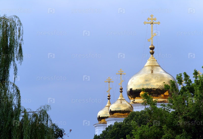 Золотые купола православной церкви, виднеющиеся из-за деревьев