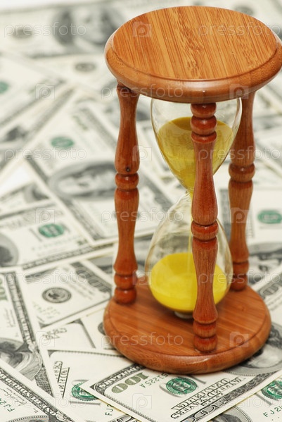 Песочные часы на фоне долларов крупным планом