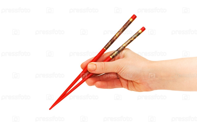 Китайские палочки в руке на белом фоне