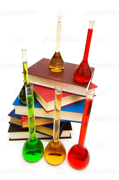 Пробирки с цветной жидкостью и книги на белом фоне