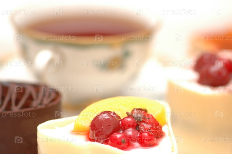 Сладкие пирожные с чашкой чая крупным ланом