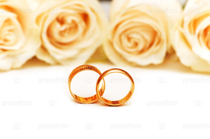 Белые розы и обручальные кольца на белом фоне