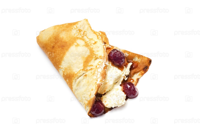 Блин с творогом и клубникой на белом фоне