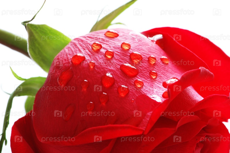 Красная роза с каплями воды крупным планом на белом фоне
