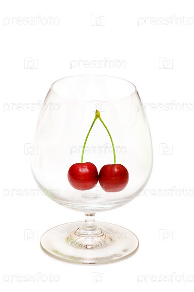 Спелая вишня в бокале на белом фоне