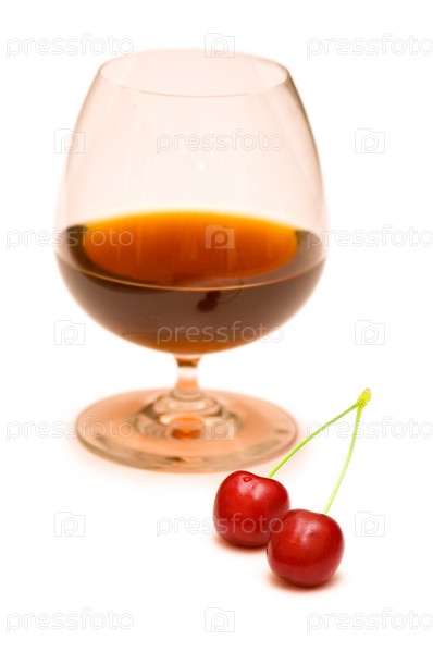 Бокал вина с вишней на белом фоне
