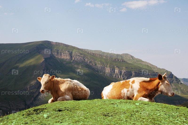 Коровы на вершине холма на фоне гор