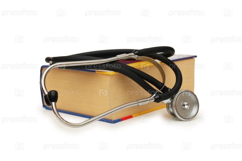 Медицинский стетоскоп на книжке на белом фоне
