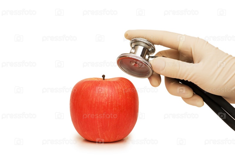 Красное яблоко и рука со стетоскопом на белом фоне
