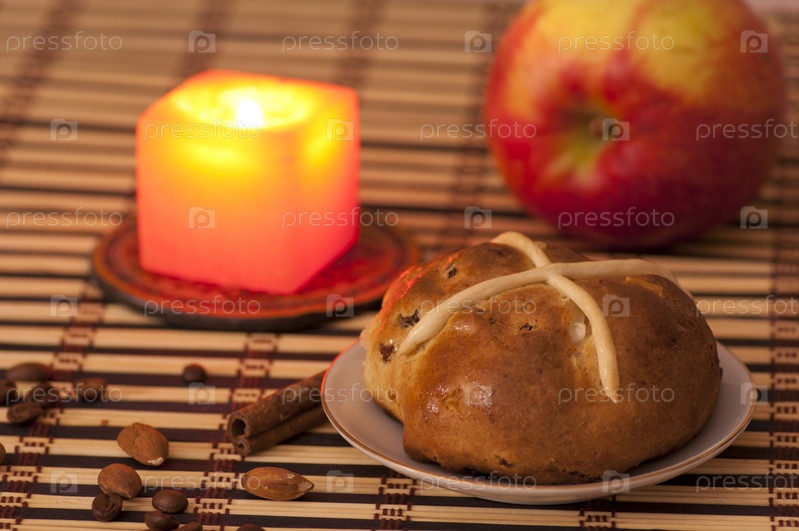 Булочка с изюмом и курагой с крестом, романтический натюрморт