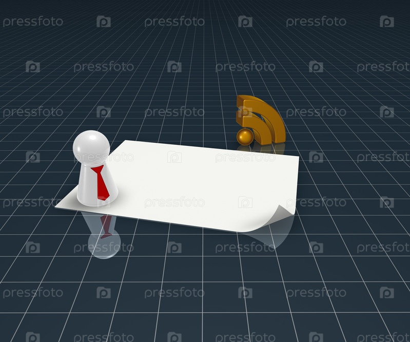 Символ RSS, фигура с галстуком и пустым белым листом - 3d иллюстрация