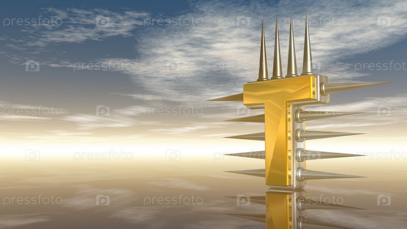 Буква t с металлическими шипами под облачным небом - 3d иллюстрация