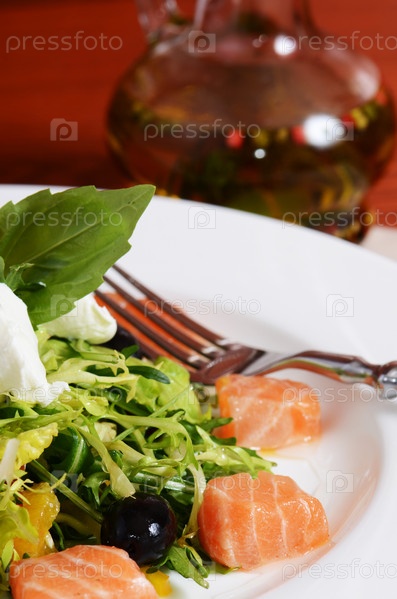 Салат с лососем и сыром маскарпоне, помело и салатом. Ресторанное блюдо