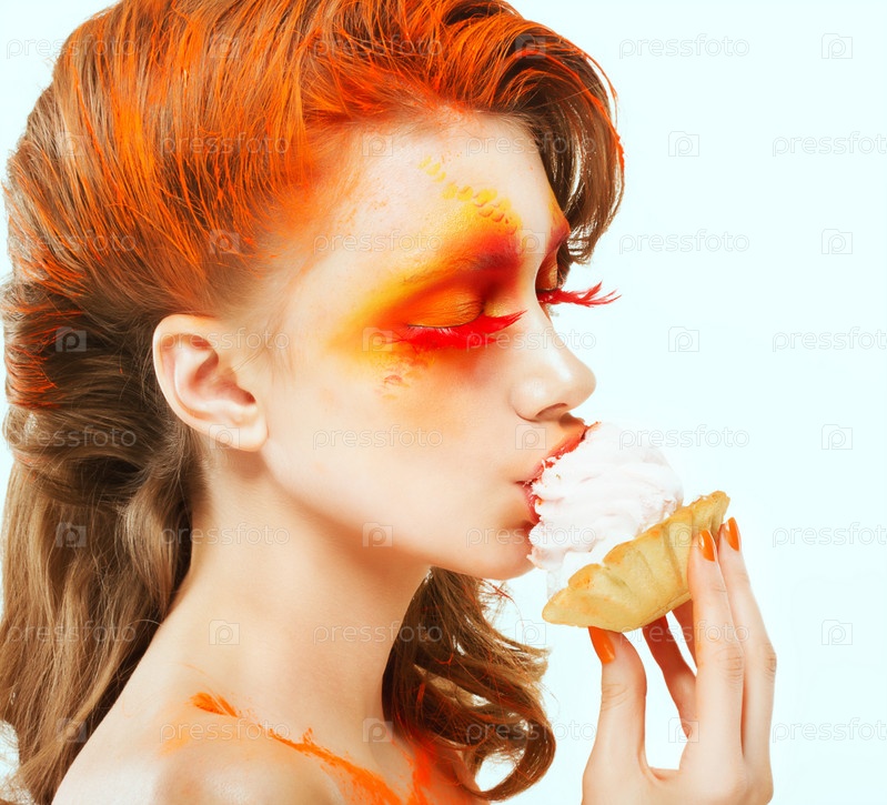 Творчество. Профиль рыжей женщины, которая ест пирожное с кремом. Румянец