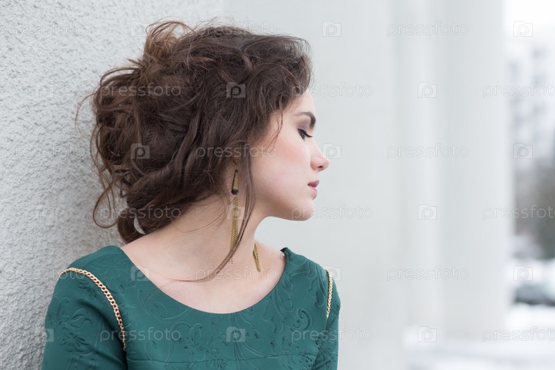 Романтическая женщина в зеленом платье на фоне белой стены на улице. Одиночество