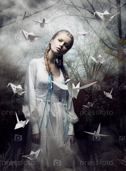 Тайна. Оригами. Женщина с белыми бумажными голубями. Сказка. Фэнтези