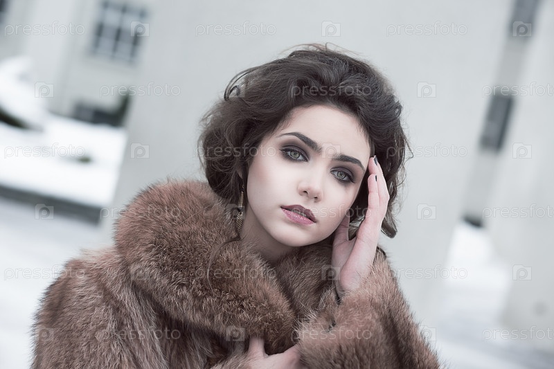Женственность. Портрет молодой брюнетки в коричневой шубе на открытом воздухе