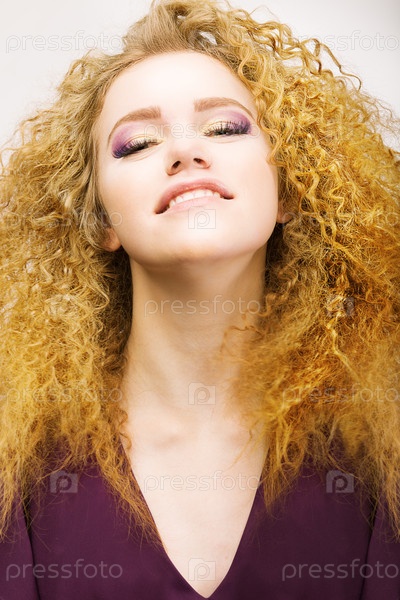 Удовольствие. Счастливая рыжеволосая кудрявая женщина. Наслаждение