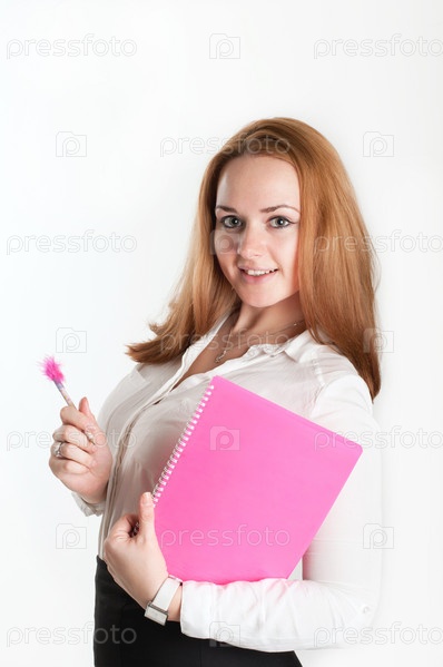 Девушка с розовой папкой на светлом фоне