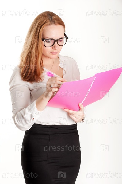 Девушка с розовой папкой на светлом фоне