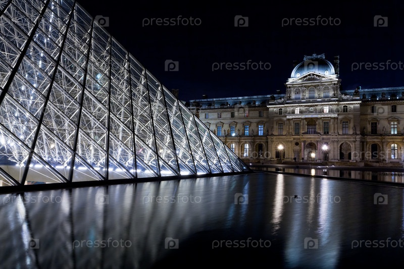 Дворец Лувр и пирамида, Париж, ночью