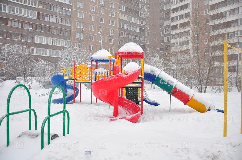 Игровая площадка во время снегопада, Москва, Россия