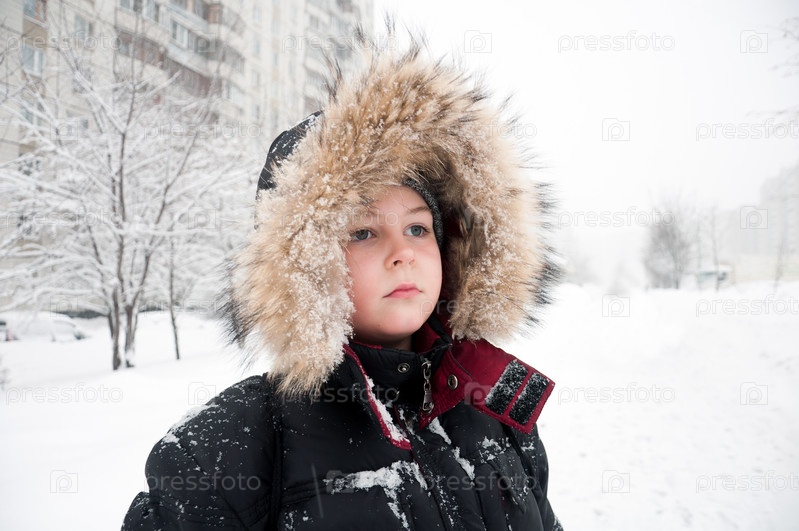 Портрет мальчика в зимней одежде во время снегопада