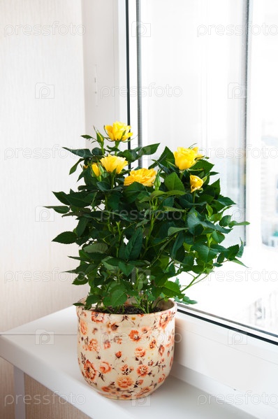 Желтые розы на подоконнике
