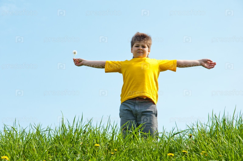 Мальчик стоит на зеленой траве