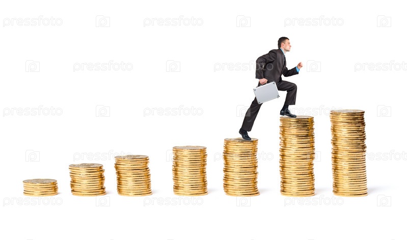 Бизнесмен идет вверх по золотым монетам