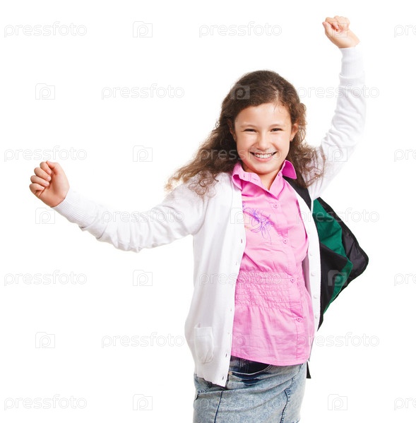 Улыбающаяся школьница с рюкзаком, изолированная на белом фоне
